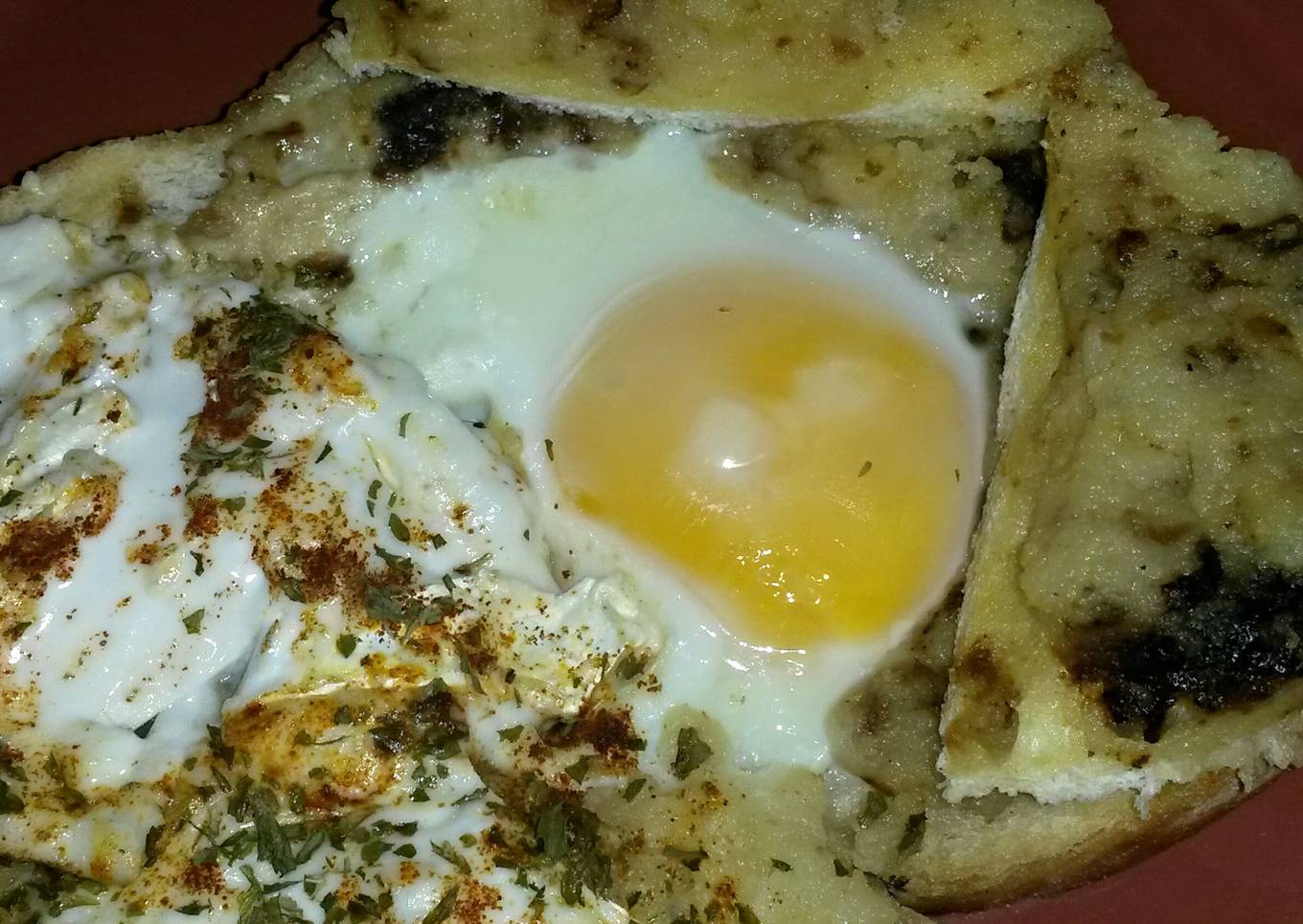 - Alternately you can fry one side of bread bread just a little more than the other, keeping both side sides cooked but just one a little browner.Removr bread. Spread mashed potato on the side that is softest , make cut out , add bread bake to frying pan add egg and then precede as follows when egg has cooked on bottom but still runny elsewhere remove from pan ,place on baking plate or tray add bread cut outs, cheese and seasonings and the cheese and put under grill to be toasted off.