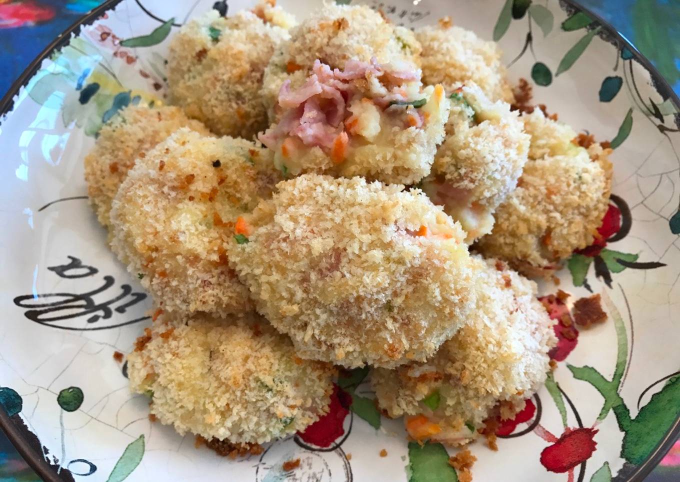 - Gently whisk the eggs and season the breadcrumbs. Scoop 1 potato ball to egg wash then rolling around in breadcrumbs. Put it back to the baking sheet. Repeat this action until done.
