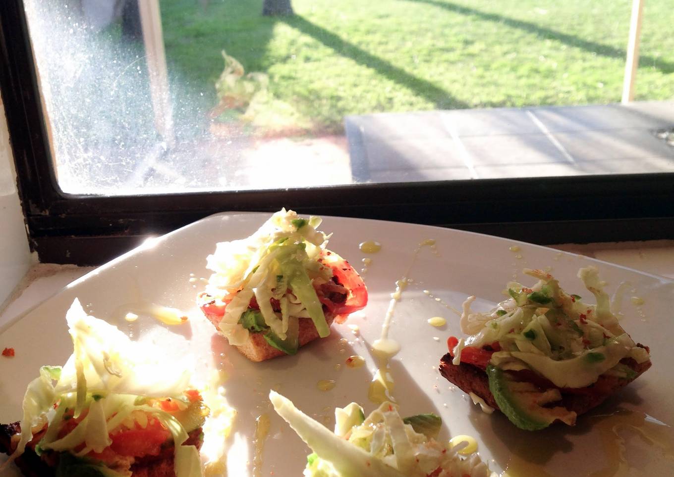 - On top of each bread piece, place slice of softened avocado, a slice of dill, a slice of cooked warm tomato, cheese and cabbage mix.