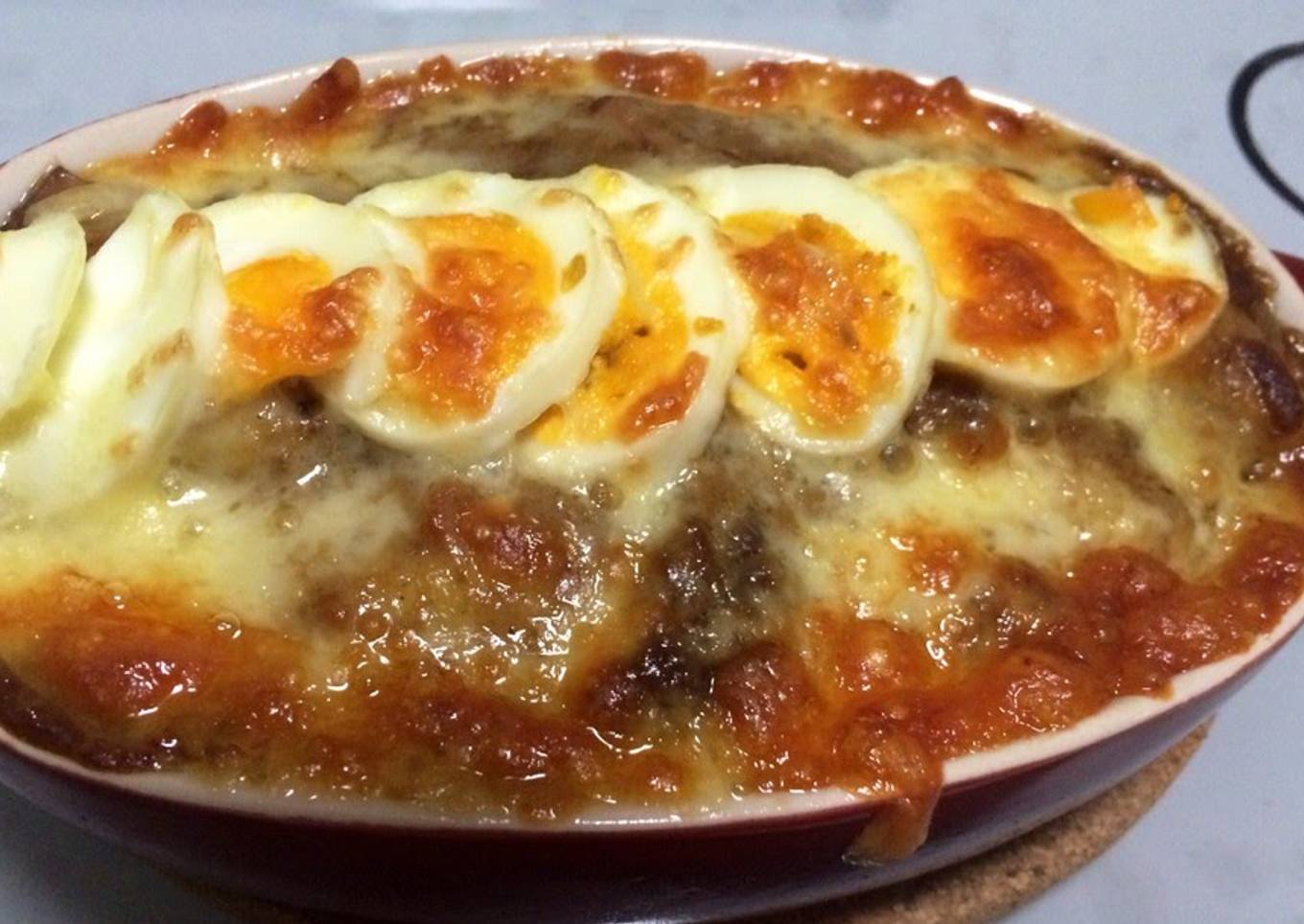 - Grease a heatproof container with butter (or margarine), then top with the gnocchi, curry, sliced boiled eggs, cheese for topping, and grated cheese, in that order.
