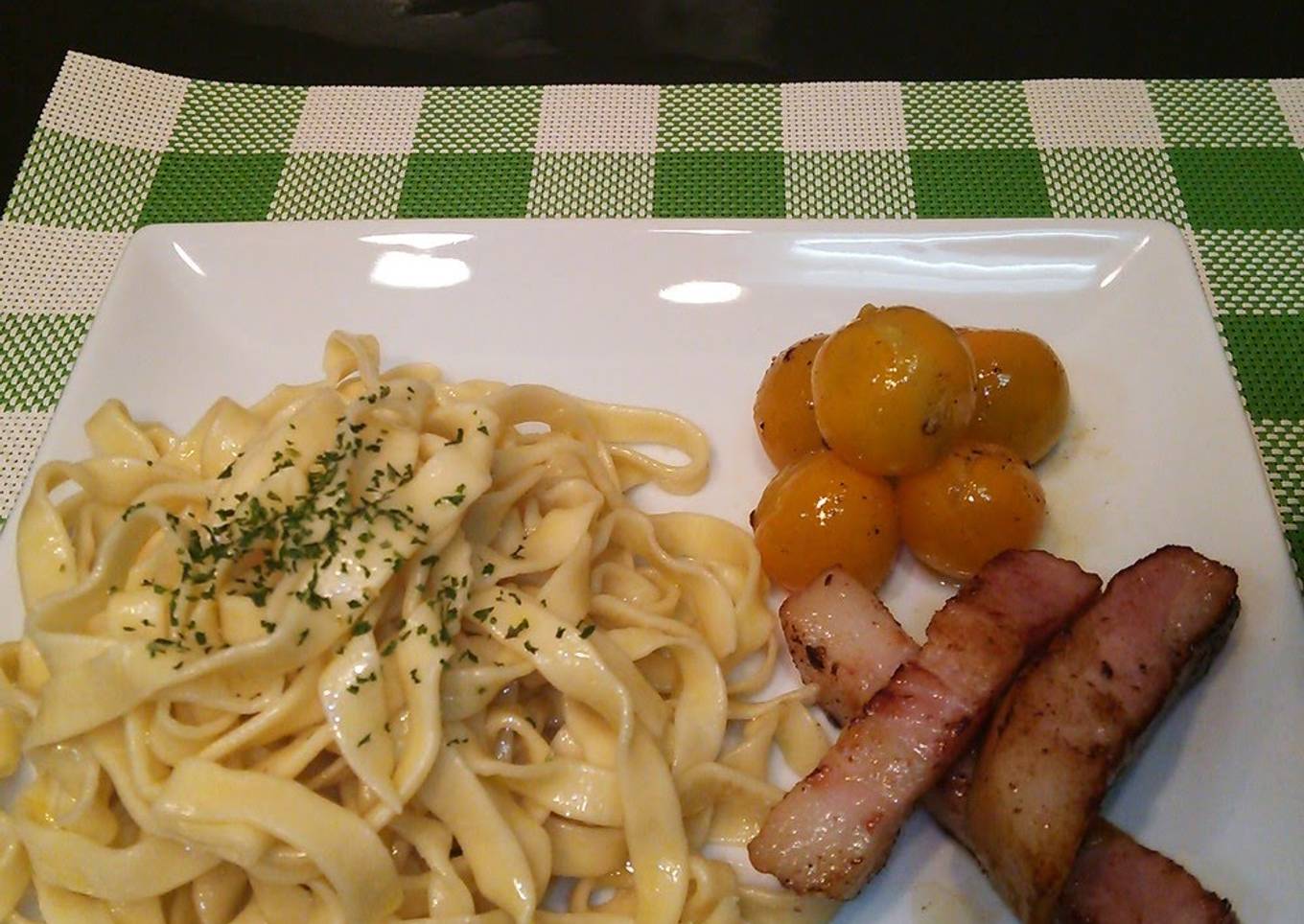 - "Homemade Pasta Dipped in Carbonara Sauce".